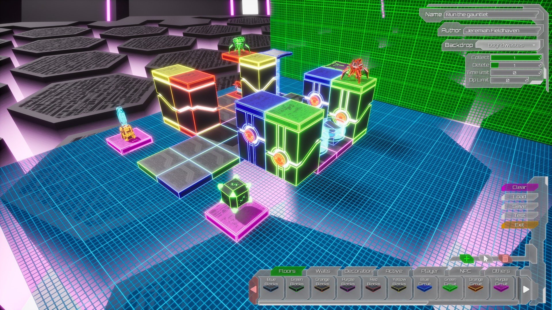 The in-game level editor is available from v0.0.8 onward. WARNING: it is entirely possible to create levels that break the game if you are not careful. While the editor attempts to prevent this, there is a possibility that user-created levels could either be impossible to complete, or produce odd graphical effects!